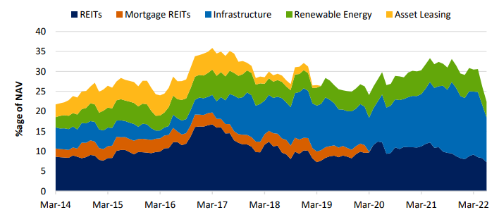 We invest in property through listed companies, typically structured as real estate investment trusts (REITs). These are essentially investment vehicles that purchase real estate holdings and rent them out, providing indirect exposure to global property markets and with daily liquidity which allows us to adjust exposures in real time. Rising rates and the risk of recession are headwinds for a sector which is still recovering from Covid disruption. Our current allocation is small by historic standards and focused on defensive segments such as residential or on niche growth markets such as infrastructure, data centres or logistics.