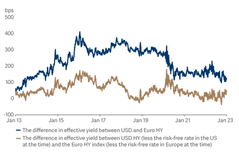 Figure one: The difference between US and European high yield – the US yield typically offers greater yields, but when you compare the spread between the high yield rate and the risk-free rate in each region the difference is reduced