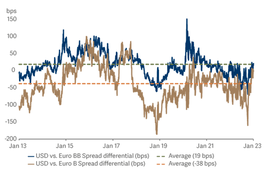 Figure three: US BBs tend to offer a better yield than Euro BBs, but US Bs generally offer less yield than their European equivalents