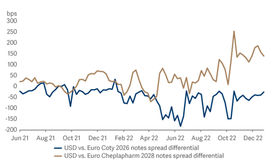This all shows that the comparison between Euro and USD high yield is not as simple as investors might like to think – and that the picture can change. Even within individual businesses the story can be complex. Let’s look at two companies and one final chart. Coty is a global beauty products business; Cheplapharm is a European-headquartered pharmaceutical business. Both issue Euro and USD bonds. In figure four we compare the credit spread pick-up on both companies’ USD bonds over their Euro bonds. The bonds compared have the same maturity and place in the capital structure – so face identical credit risks. With Coty investors have enjoyed a healthy premium by opting for its Euro bonds – peaking at over 150bps last summer. With Cheplapharm the premium has been found investing in the company’s USD bonds. So, far from being a top-down opportunity, two individual credits are giving opposing cross-currency opportunities!