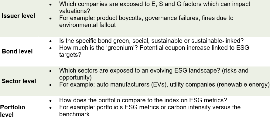 Combining these leads to decisions that can help improve performance and augment the assessment of potential risks. All of these factors interact, but some will have higher importance depending on the sector, company or specific bond.