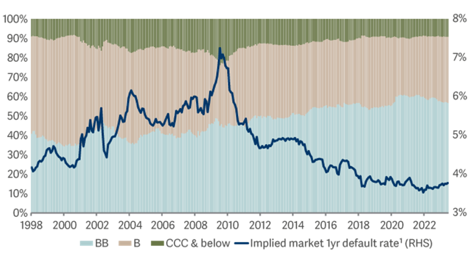 Source: ICE BofA Merrill Lynch Global High Yield Constrained Index as at 30 June 2023. 1Implied market 1yr default rate is based on S&P median default rates 1981-2021.
