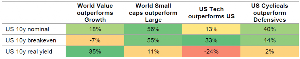 In recent weeks, the order of battle has shifted, with real yields leading the march higher as breakeven moves have stalled. While this suits value stocks, it is more problematic for growth stocks that have been huge beneficiaries of both higher breakevens and lower real yields. Rising breakevens are important for size, cyclicality and the relative performance of tech. Figure 1 captures some of these heuristics.