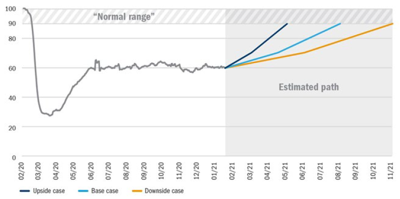 Faster vaccine distribution and uptake could accelerate the path to normal (ie, the upside case). Developments that could impede a return to normal (ie, the downside case) include the emergence of variants that are resistant to current vaccines or slower uptake of the vaccine in certain places (because of people’s unwillingness to get vaccinated or shortfalls in supply).