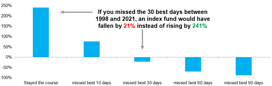 Figure 1: The fear of missing out – FTSE all share total cumulative return (1998-2021)