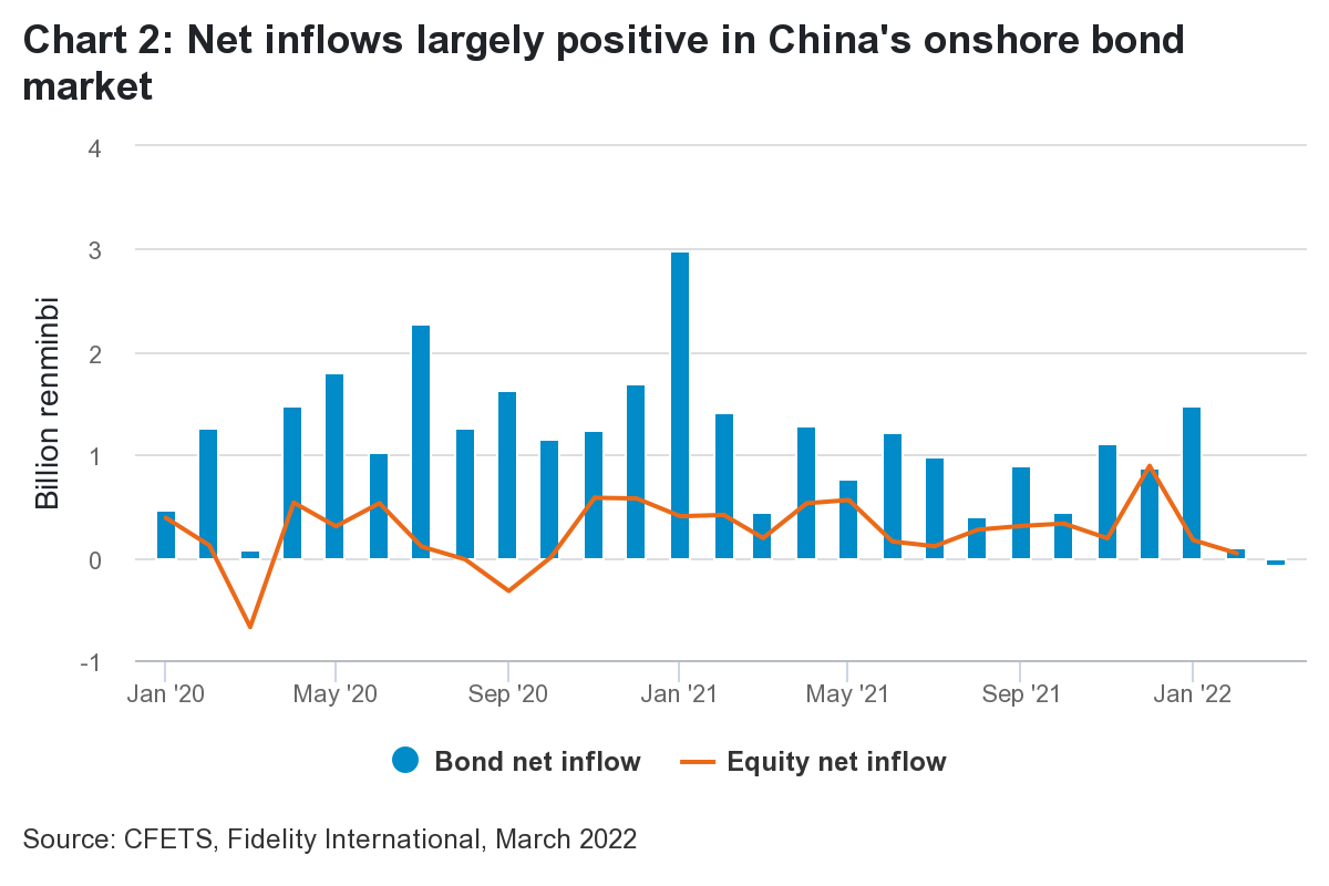 China’s attractions as a haven are a confluence of contrarian factors: its giant economy and deepening financial markets are overlaid by capital account controls and a managed exchange rate. But for global fixed income investors, the resulting combination of relatively high yields and strong diversification benefits saw the country’s onshore bond market attract positive net inflows every month for about two years, until February.