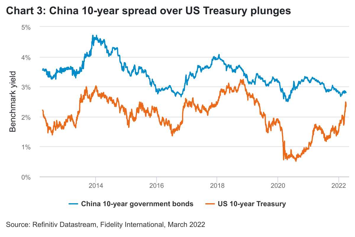 The country recently set a growth target of around 5.5 per cent for this year, while most of the world is grappling with looming stagflation - and the rising risk of recession in some regions. We think this is an ambitious growth target but it also boosts the case for more policy stimulus in the coming months, which should provide support for the onshore bond market. At the same time, China is facing milder inflationary pressure than in the West.
