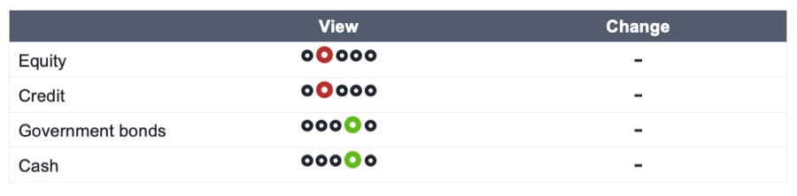 In credit, we raise conviction on our overweight investment grade position as a defensive move. We keep our underweight to high yield and now go underweight EM hard currency debt too.