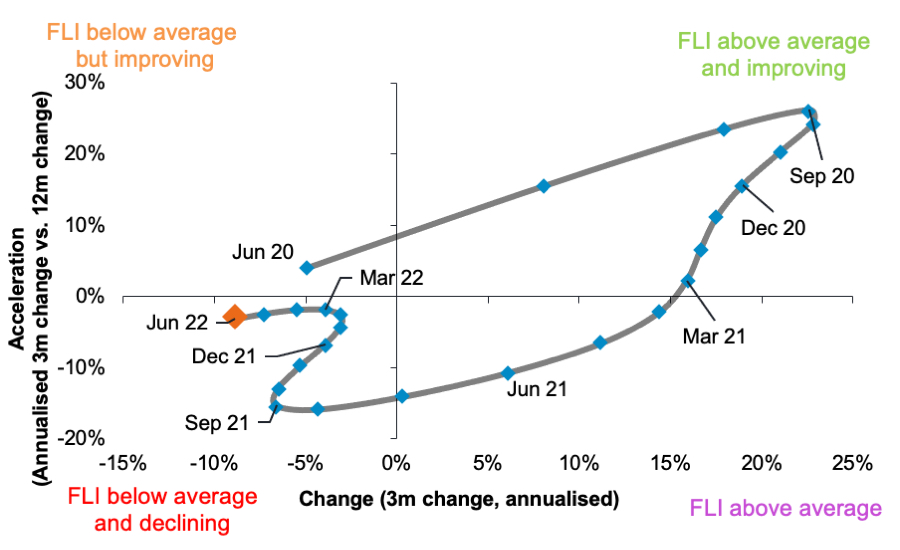 The FLI Cycle Tracker deteriorated further in June, moving deeper into the ‘bottom-left’ quadrant (below average and declining). This was the 11th straight month of the FLI indicating below average and declining activity led by broad-based deterioration across sub-sectors. The deceleration in global activity continues to be driven by the multiple shocks hitting the global economy this year, including the Russia-Ukraine war, China lockdowns, inflation pressures and financial conditions tightening by central banks.