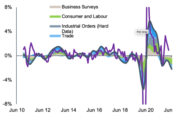 Global trade shifted to the ‘bottom-left’ quadrant (below average and declining), for the first time since November last year (although downward revisions to the previous month’s data showed the shift already occurred in May). Commodities also slipped back into the ‘bottom-left’ quadrant in June, for the first time since January 2022. The move was driven by sharp falls in the Baltic Dry Index, along with more modest declines in Australia’s forward orders.