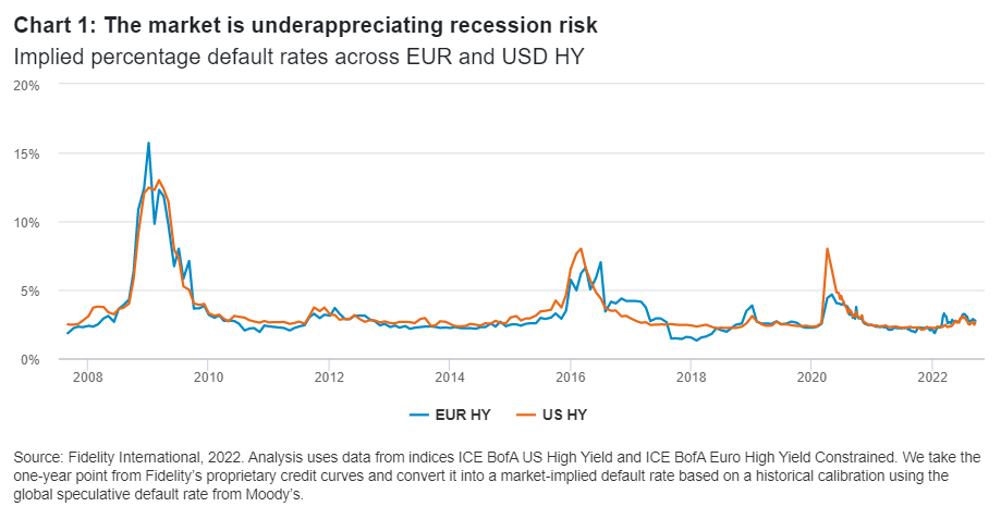 We think one of the biggest and most underappreciated risks in credit markets right now is the threat of rising default rates. This is especially true in the high yield market. According to Fidelity International research, market implied default rates for the high yield segment currently stand at just 2.6 per cent in the US and 2.8 per cent in Europe over the next one year. By comparison, according to research from Bank of America Merrill Lynch, realised US high yield default rates peaked at around 14 per cent in 2009 and around 10 per cent in 2020 (see Chart 1).