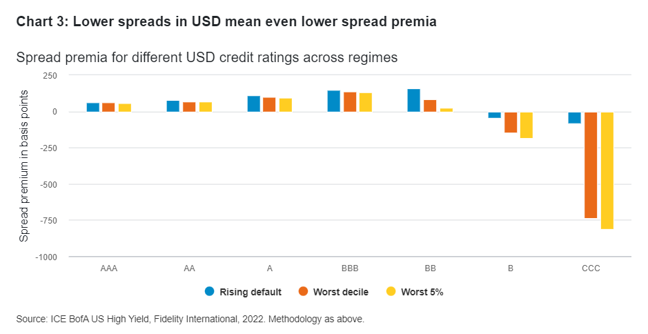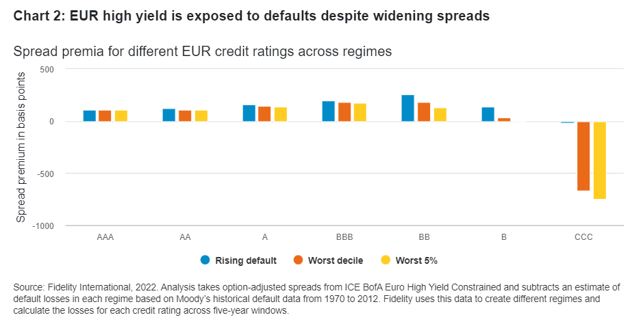 This mismatch between what the market is pricing in and the broader macro picture poses new challenges for investors accustomed to the ultra-low default environment of recent years. It also spells bad news for those exposed to the lowest quality parts of the market, according to Fidelity analysis of spread premia. Our quantitative research team monitors current yield spreads minus an allowance for default losses conditional on a particular regime to calculate a "spread premium" in EUR and USD. These different regimes include: