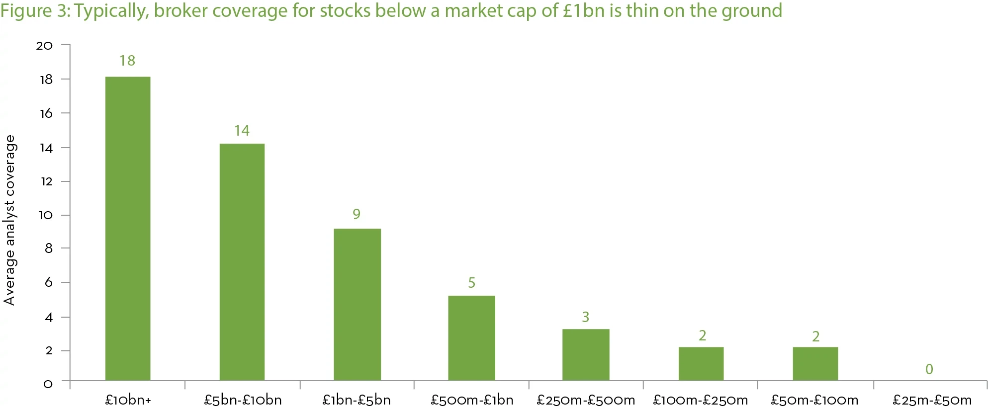 The below chart shows the average number of analysts covering each market capitalisation band. Five years ago, 11 analysts on average covered £500m-£1bn market cap names. This has now reduced to five and this trend continues as you move down the market cap scale.