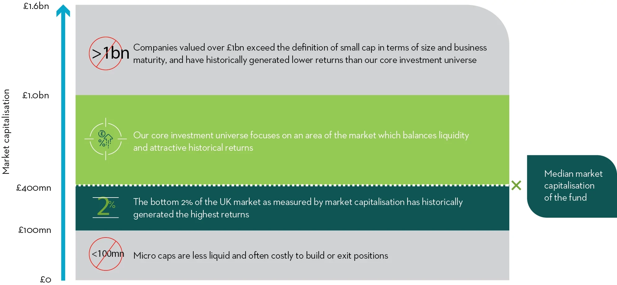 We believe that this market cap profile healthily aligns to the areas of the market that have been most successful over the last 67 years. According to the Numis indices 2022 annual review, the greatest returns over this period have been generated by companies that have sat in the bottom 2% of UK market capitalisation, which is currently around £400m and below. There are risks with all investment, and this market cap range in particular includes risks of high volatility and liquidity.