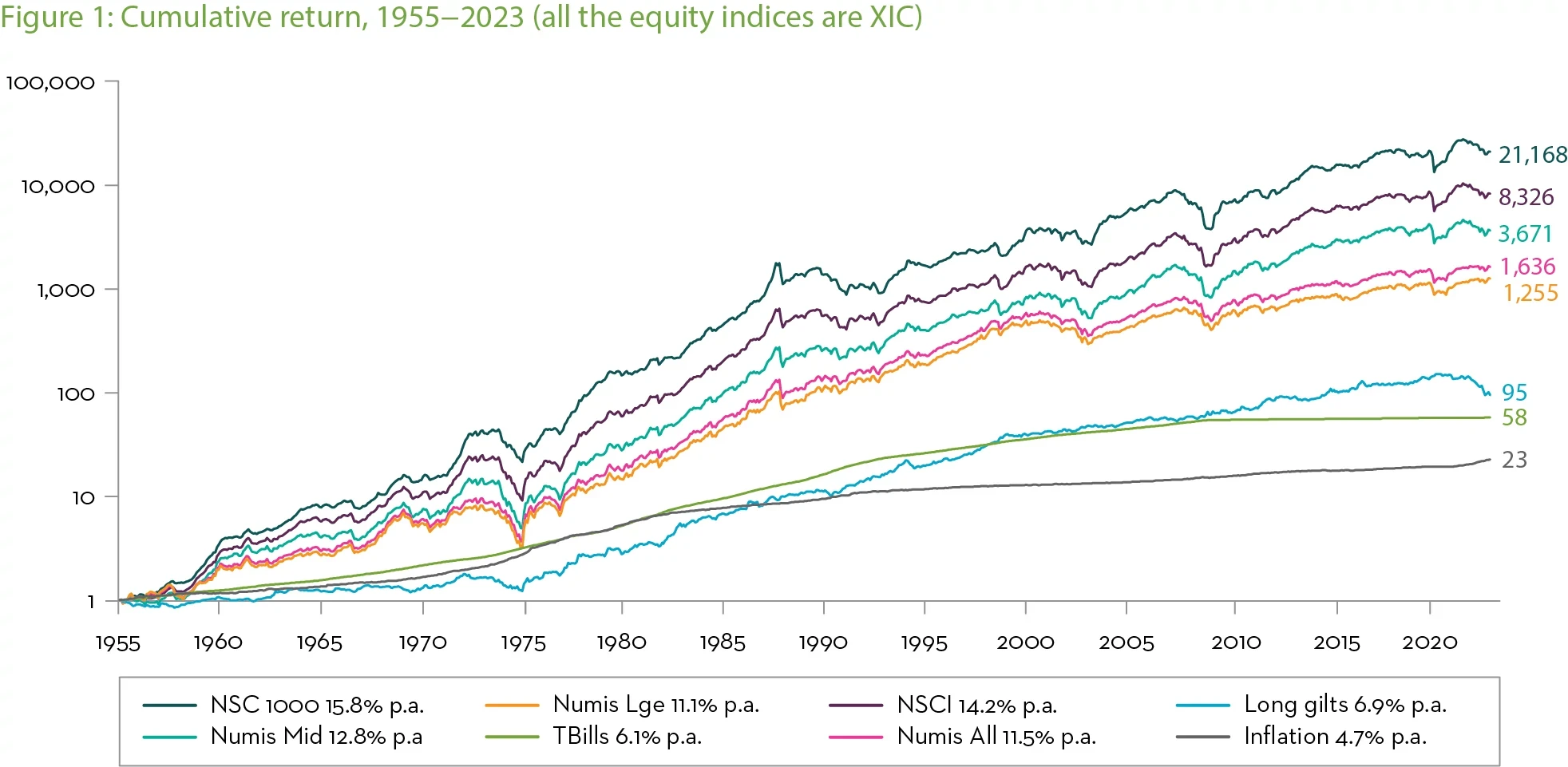 The benchmark for our UK smaller companies strategy is the Numis Smaller Companies Index (NSCI), which is rebalanced on an annual basis to reflect the lowest 10% of market capitalisation within the UK stock market. At the start of 2023, this meant the largest company in the index had a market cap of £1.6bn.