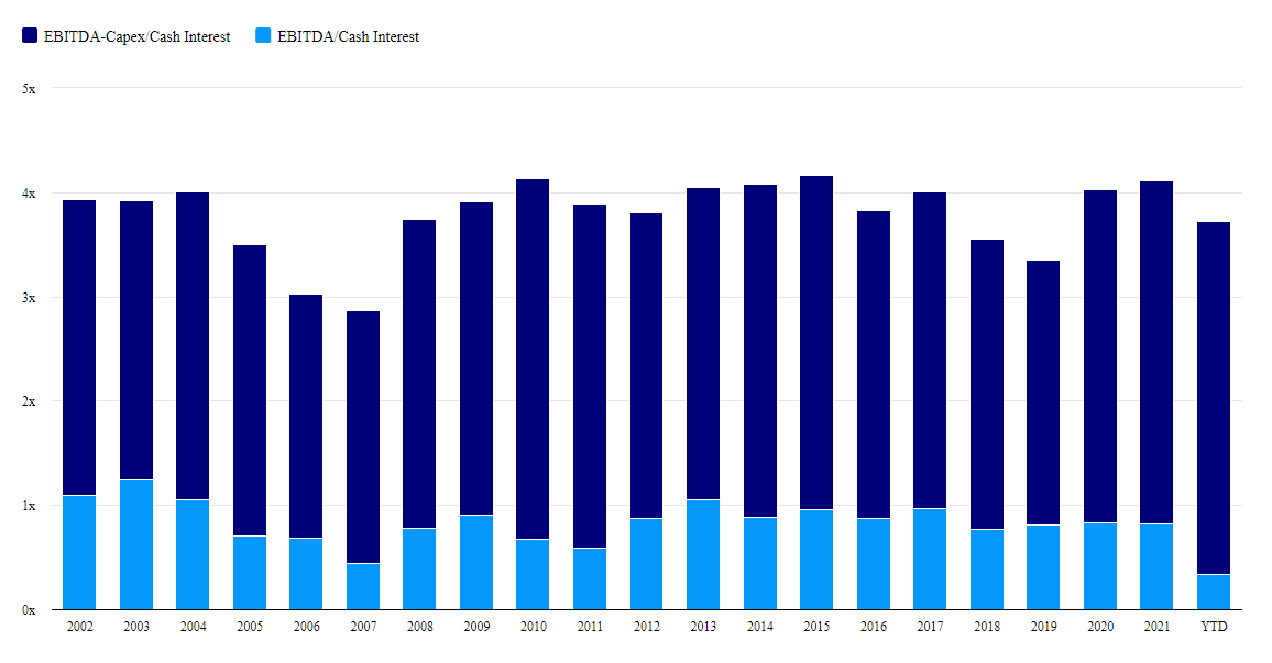 If the Fed continues to raise interest rates, investors may start to become concerned about issuers’ ability to service their debt. However, as highlighted in the below table, the average borrower has entered this cycle in a strong position. Interest coverage ratios at the end of 2021 were near their highs, leaving companies with sufficient ability to absorb higher interest expense.