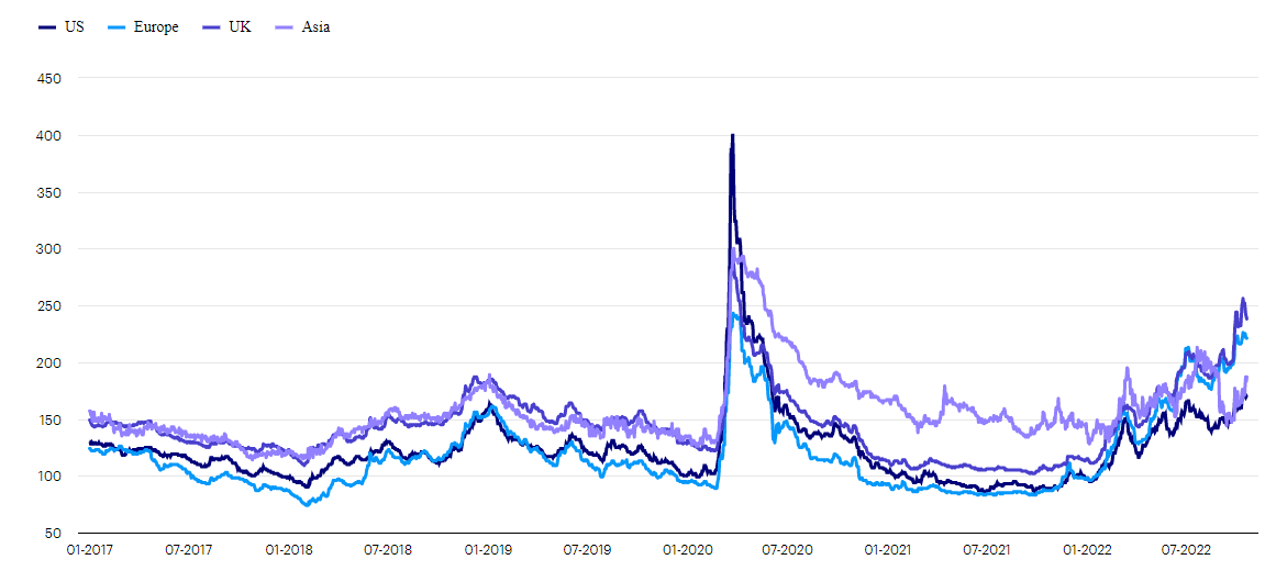 Credit spreads have widened significantly this year and, outside of crisis periods like 2008, have rarely been wider than they are today. This is creating good income opportunity for corporate bond investors. Indeed, it is worth remembering that the spread on corporate bonds is paid over the government bond yield. Government bond yields have also risen considerably over the course of 2022, making overall yields very attractive.