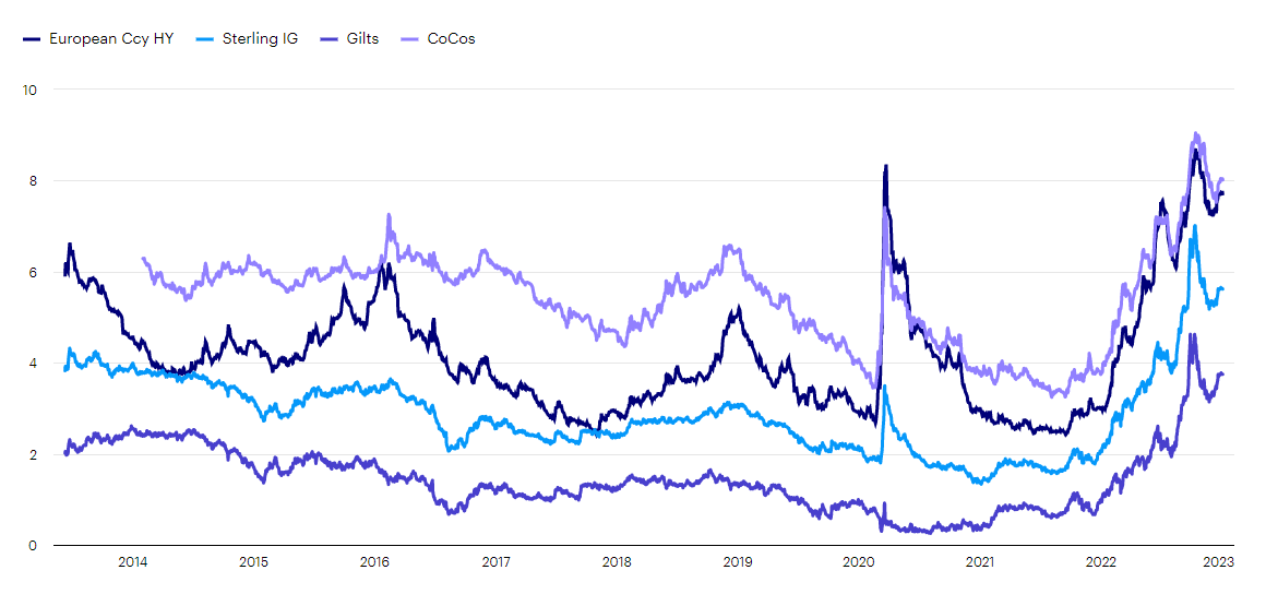 Lastly, valuations are much better. We’re getting paid a lot more yield. Government bonds yields are at or near the highest levels since before the financial crisis. Credit spreads are at the upper end of the last decade’s range. Yields of 3.5% for two-year gilts, >5% for sterling investment grade or 7.5% for European high yield bonds are a much more comfortable starting point for investors than the levels we had.