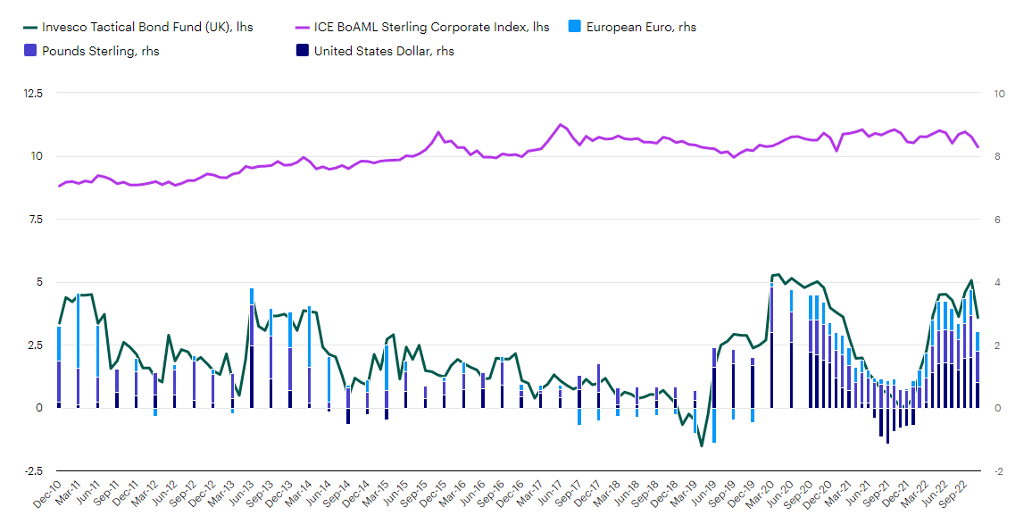 Source: Bloomberg, Invesco. Data to 30 November 2022. Contribution to duration: data prior to and including 30 June 2019 is sourced from Barclays Point. Excludes some categories. Please note the ICE BOAML Sterling Corporate Index is not a target, constraining or comparator benchmarks of the fund. The comparative information shown here is to illustrate the fund manager's active investment approach and provide broader market context.