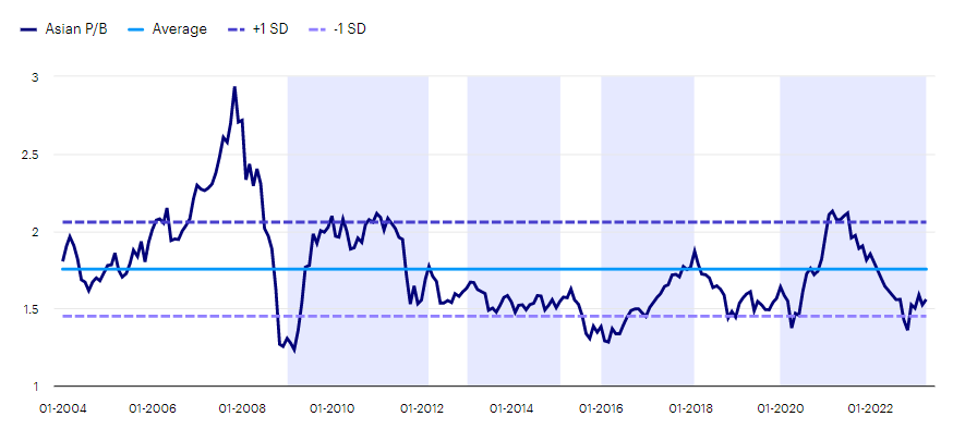 Looking at Asian markets in aggregate, the valuation of the MSCI Asia ex Japan index as represented by its price-to-book ratio recently reached such an inflection point.1 This has only occurred a handful of times over the last two decades.