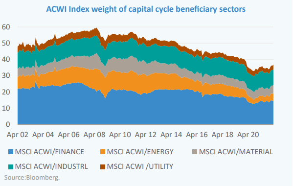 The big picture is that a number of capital cycles are turning, and investors need to refocus their attention onto supply side dynamics, and towards sectors which have been overlooked for the majority of the post-GFC era. Market leadership is likely to change over the next decade, from technology and social media to industrials, resources and infrastructure. As ever at turning points, benchmark indices are underexposed to tomorrow’s winners. The Energy, Materials, Industrials, Utilities and Financials sectors have dwindled from nearly 60% of the MSCI ACWI index in 2008 to less than 35% at the end of 2021. This argues very strongly in favour of funds with an active, benchmark-unconstrained, stockpicking approach, and a strategy which combines Quality and Value characteristics.