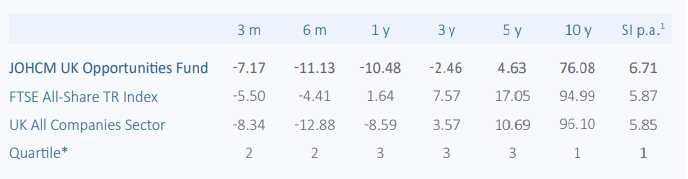 Source: JOHCM/Bloomberg/FTSE International. NAV of share class A in GBP, net income reinvested, net of fees, as at 30 June 2022. Benchmark: FTSE All-Share TR Index (12pm adjusted). Performance of other share classes may vary and is available upon request. Inception date: 30 November 2005. *Lipper Hindsight, IA UK All Companies Sector Rankings to 30 June 2022. Note: The current managers took over the fund on 1 October 2017. 1 Annualised.