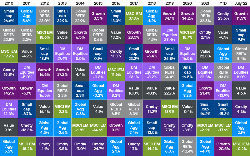 Source: Bloomberg Barclays, FTSE, MSCI, Refinitiv Datastream, J.P. Morgan Asset Management. DM Equities: MSCI World; REITs: FTSE NAREIT Global Real Estate Investment Trusts; Cmdty: Bloomberg Commodity Index; Global Agg: Barclays Global Aggregate; Growth: MSCI World Growth; Value: MSCI World Value; Small cap: MSCI World Small Cap. All indices are total return in US dollars. Past performance is not a reliable indicator of current and future results. Data as of 31 July 2022.