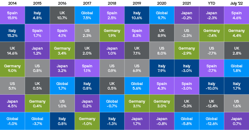 Source: Bloomberg Barclays, Refinitiv Datatsream, J.P. Morgan Asset Management. All indices are Bloomberg Barclays benchmark government indices. All indices are total return in local currency, except for global, which is in US dollars. Past performance is not a reliable indicator of current and future results. Data as of 31 July 2022.