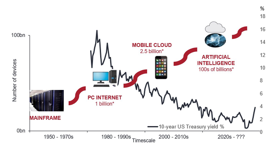 Rising technology adoption has driven lower inflation and falling bond yields over the long term