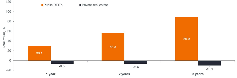 With public and private real estate markets delivering comparable returns over the long term, the chasm that has opened up in performance over the last year is significant and provides investors with a real opportunity. REITs are currently trading at a huge circa 25% discount to net asset value (NAV) – while private real estate trades at par to its NAV according to the most recent available data.5 And since 1990, public real estate has always outperformed private real estate over the subsequent three-year period when it has traded at a 20% or more discount to NAV.