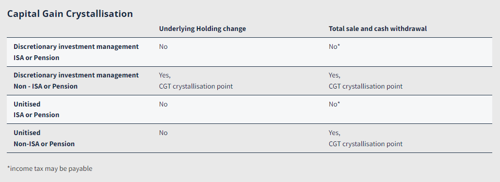 Unitised products also allow capital gains tax allowances to be used on an annual basis by selling down sufficient units of the fund, with the rest of the capital left to compound over time while being managed in an efficient and effective manner.